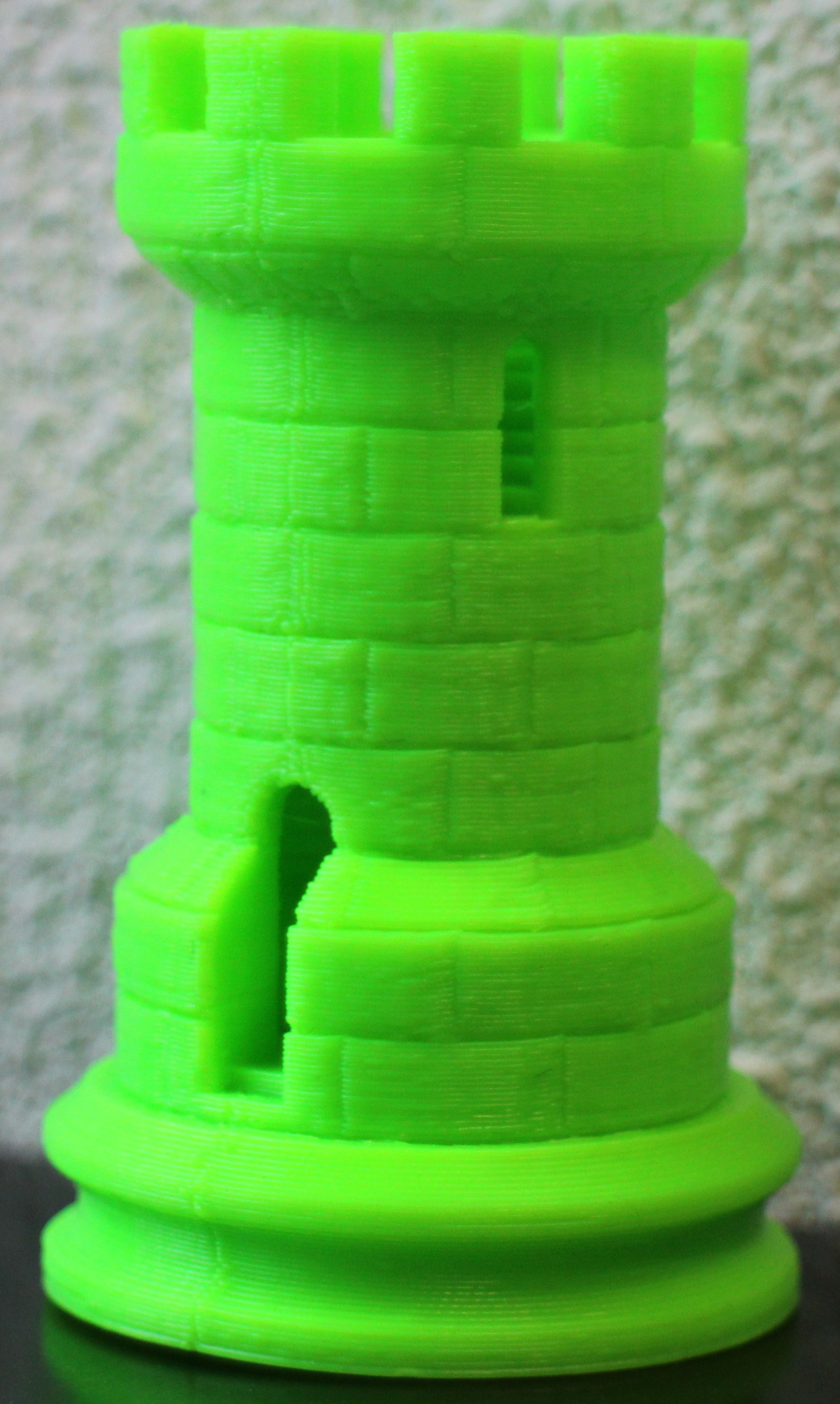 Vanwege de instellingsproblemen op de computer printen we eerst maar eens één van de drie kant-en-klare printbestanden die op de meegeleverde usb-stick staan. Een likje speciale, afwasbare lijm op de 'printplaat' en het apparaat kan opwarmen en aan de slag. In anderhalf uur tijd komen veel collega's met verbazing en enthousiasme kijken hoe een zes centimeter hoge neongroene toren wordt opgebouwd. Laagje voor laagje zien we zelfs een wenteltrap ontstaan. Wat geweldig dat dit kán. Een collega noemt het gekscherend zelfs een 'bijna religieuze ervaring'.