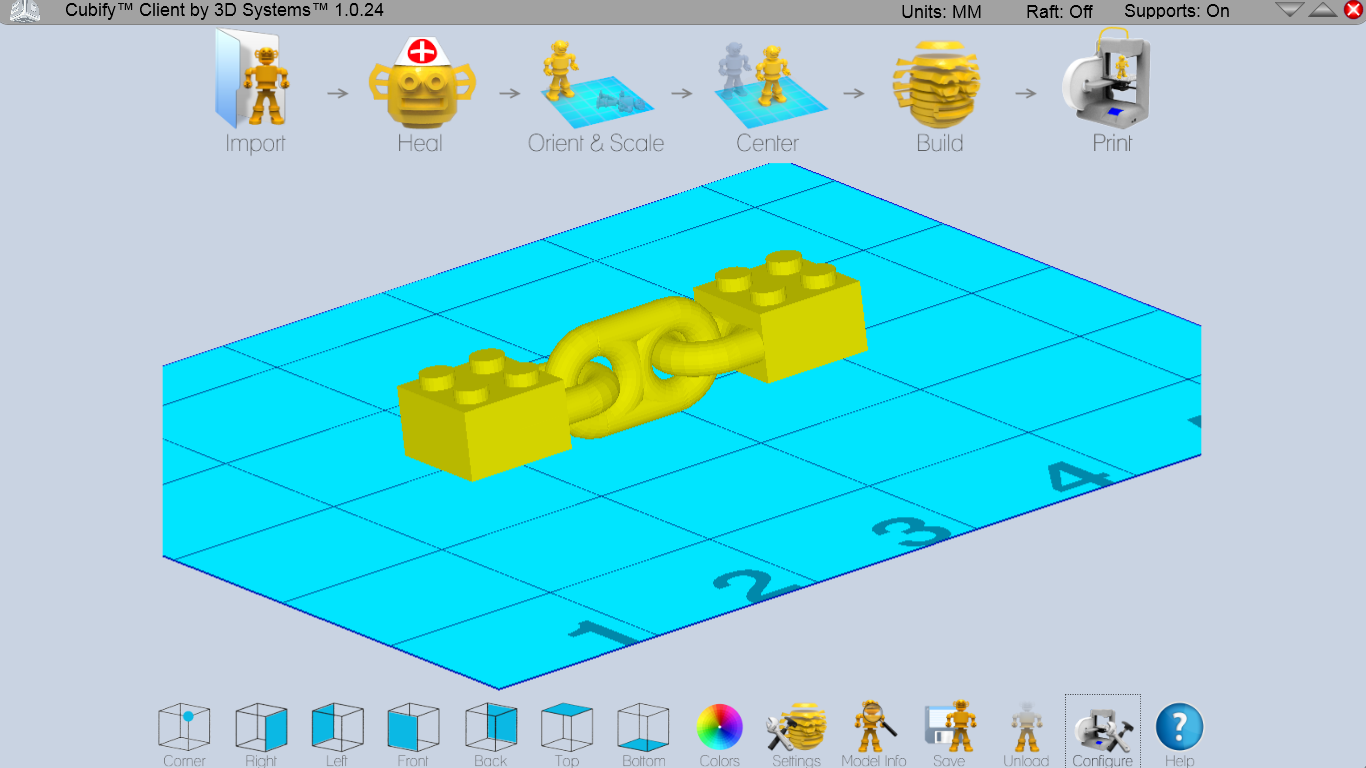 De bijbehorende Cubify-software geeft duidelijk de workflow aan: Import, Heal, Orient & scale, Center, Build en Print.Heel makkelijk, maar wij bleven aanvankelijk steken bij 'build', waarin het 3D-ontwerp wordt omgezet in een printbestand. Cubify adviseerde ons om de Windows-instellingen om te zetten naar 'USA'. 'Soms hebben locatie-instellingen invloed op de interpretatie van getallen.' De software is eenvoudig, maar het gebruiksgemak kan nog wel iets beter: