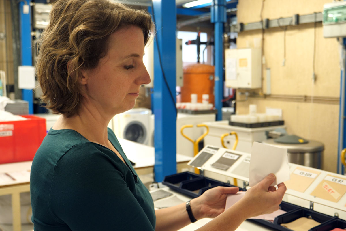 We kijken hoe goed het wasmiddel uit het wasgoed is gespoeld. Daarvoor meten we de hoeveelheid wasmiddeldeeltjes die nog in de katoenen lapjes zitten die we meewassen.